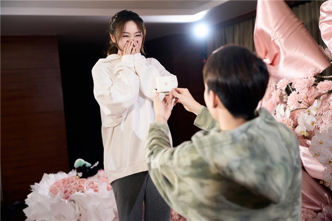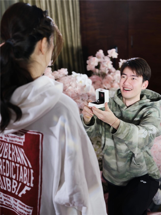 这份用心,在其求婚中更展现得淋漓尽致。知晓女友的少女心,王昶便为她打造了一场粉色梦境:飘逸的蝴蝶结丝带、鲜艳欲滴的玫瑰花、点缀着月亮星星的蛋糕......就连她送的娃娃,都被细心摆放在花束上,一同等待见证幸福。在女友到来前,他反复练习跪地求婚姿势,紧张中还不忘琢磨细节“女生佩戴钻戒在哪边?”、“跪哪条腿求婚有没有讲究”。记录镜头下,这位曾征战世界赛场的运动员,忍不住坦言:“比打比赛还紧张”。