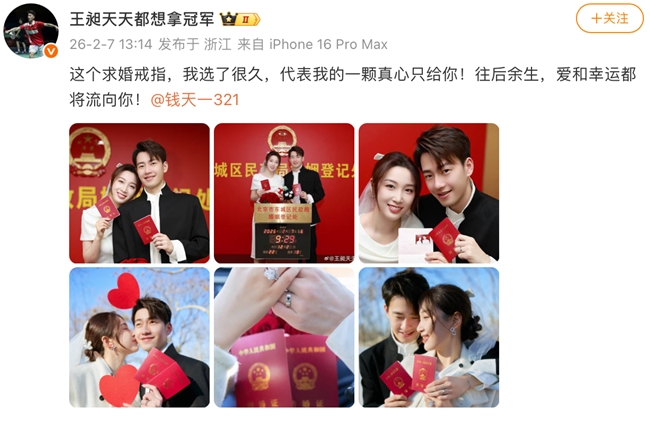 这场精心准备的官宣,处处藏着甜蜜“彩蛋”。王昶特意选择谐音为“爱妻日”的2月7日,并在13:14这一时刻郑重公布喜讯,将对婚姻“一生一世”的祈愿,静静封存于这个特殊瞬间。