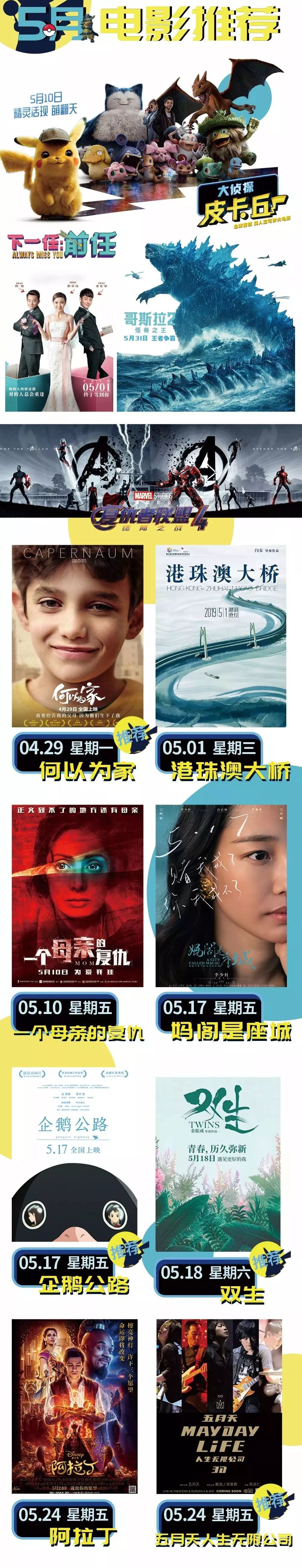 原标题:【05月01日影讯】及5月新片推荐1.复仇者联盟4:终局之战 上映时间:4月24日 推荐度:❤❤❤❤❤ 复联英雄们的最后一战! 年度期待值最高的影片,必