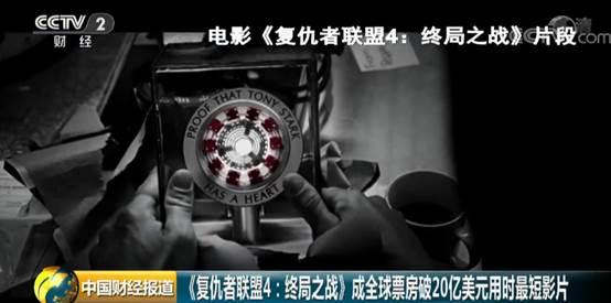 (央视财经《中国财经报道》)漫威大片《复仇者联盟4:终局之战》开画以来票房高歌猛进,短短12天即突破20亿美元,超过《阿凡达》成为电影史上突破这一票房大关用时最短的影片。