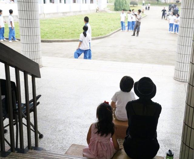 孙俪或是抱着孩子,或是和孩子们坐在阶梯上,看邓超导演电影,非常有爱。远处穿着灰色衣服的正是超哥,正在指挥大家拍戏。