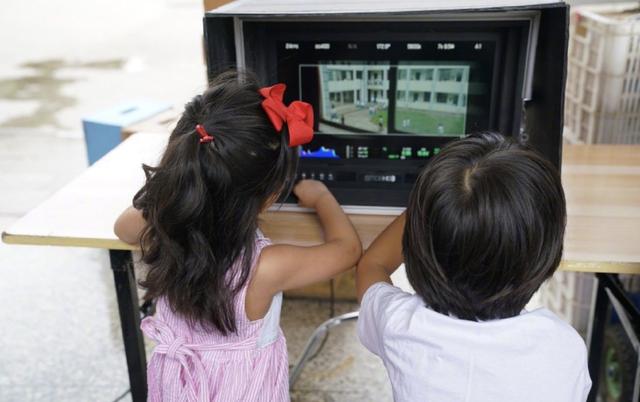 这是等等小花在探班时候拍的背影。两人看着显示屏,十分认真,但或许他们并不知道他们在看的是什么,爸爸到底在干什么。