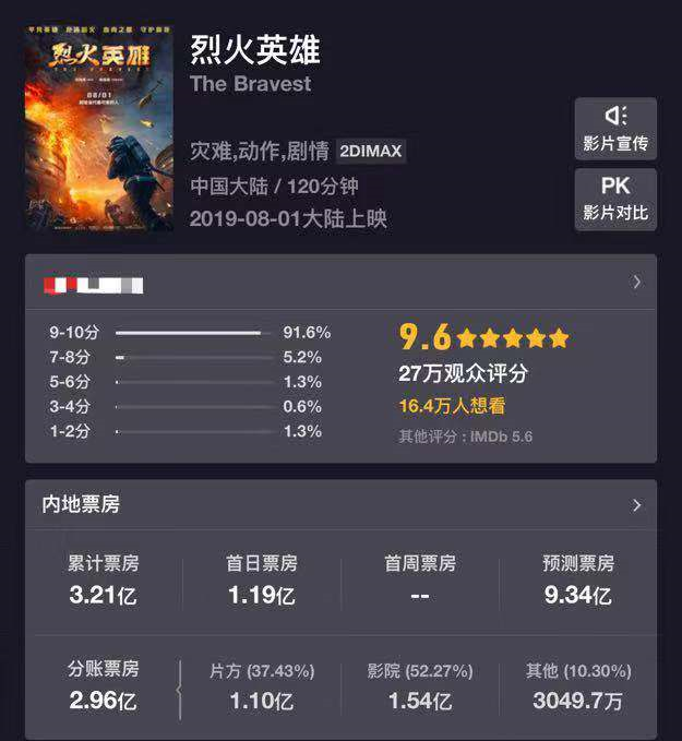 电影《烈火英雄》上映2天票房近3亿,在爆款《哪吒》的“重压”下,能取得这样的成绩实属不易,目前票务app对其票房预估接近10亿,作为一部主旋律灾难片,能有这样的成绩已经非常不错了。