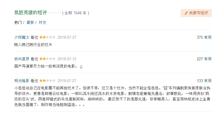 本周院线热映的电影当中,除了《哪吒》和《烈火英雄》一骑绝尘之外,另一部德云社岳云鹏主演的电影《鼠胆英雄》尤为值得注意一下。该片被关注,并非因为质量很好、票房不错,相反,这部电影在豆瓣电影专区被影迷讽刺为“贱人贱己贱行业”。截至目前,这则评论更是被影迷点赞到热门短评的第一位。