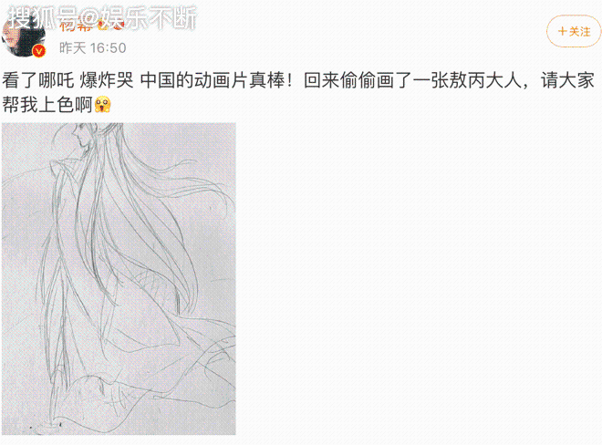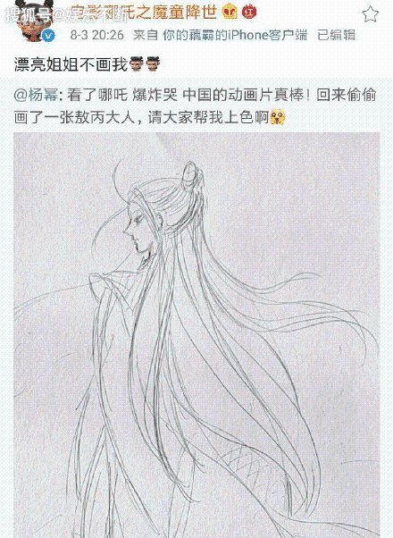 不得不说,仅仅是几笔草图都将敖丙的神韵表现的非常好,杨幂发动网友给他上色,网友们也是很有才,上色之后的图就刚好看了,不得不说这一届的网友太有才了,大家不妨来欣赏一下。