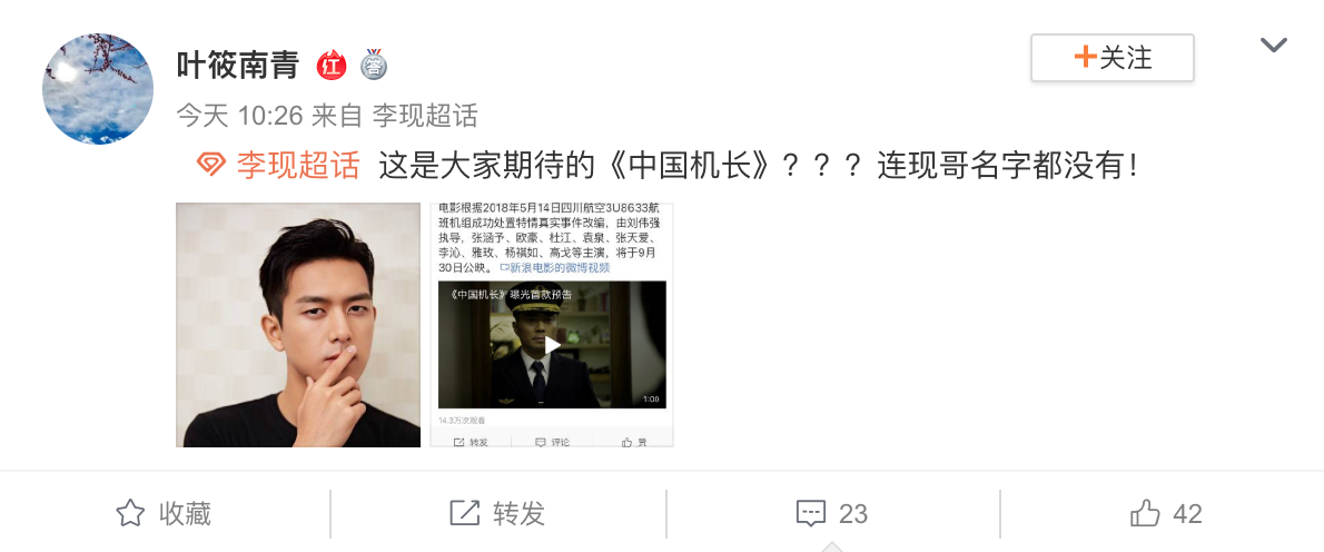 原来,电影《中国机长》中李现饰演管制中心管制员,虽说是配角客串,但剧照还是挺养眼挺帅气的,然而这样一个角色却不配出现在官方宣传中,各大大小小的宣传都看不见李现的名字,难怪李现的粉丝都怒了。