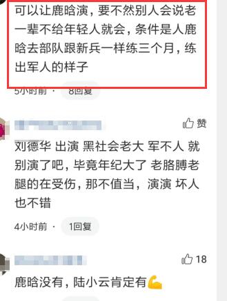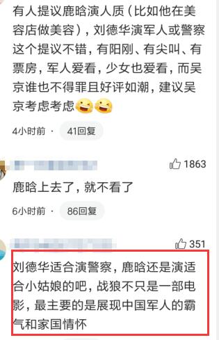 不过网友也是表示,最好是用鹿晗,免得说不给新人后辈机会,不过有一点,鹿晗要有军人的样子,像在《上海堡垒》中,虽然穿着军装,但是连板寸都没有的鹿晗,看起来没有一点军人的样子,更像个娇羞的女孩被网友吐槽!如果来演《战狼3》,最好先去历练成军人的样子,你怎么看呢?