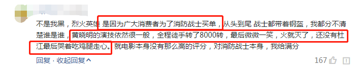 有观众表示《烈火英雄》之所以高票房的原因,是因为广大消费者为消防战士买单。虽然几位演员互飚演技很出彩,但是出彩的演员没有拼凑出一部好电影。