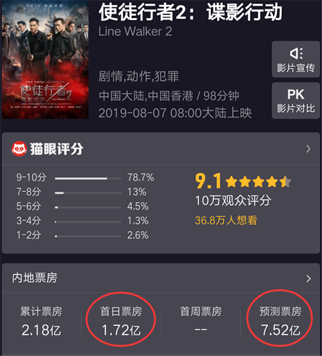 先来看一下《使徒行者2:谍影行动》的表现如何,7号首日上映,斩获1.72亿票房,在《哪吒》《烈火英雄》围追堵截的情况下取得这个成绩着实不错,要知道《扫毒2》首日不过也才1.45亿。能取得这个成绩主要依靠《哪吒》带火了市场,再加上七夕档期,“2亿”单身狗都看兄弟去了。票房数据虽然亮眼,不过口碑却不怎么样,豆瓣评分从7.5分一路滑到6.7分,不出意外的话,还会接着下降。目前平台给出的预测总票房是7.52亿,估计连这个都不一定能达到,截止发稿,8号的票房还不到5000万。