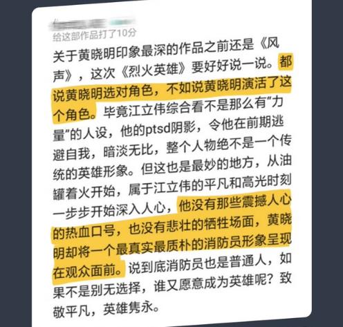 此前烈火英雄主演阵容曝光时,许多观众曾对选角表示质疑。但一经上映,观众纷纷真香,并表示黄晓明这次演活了消防员,贡献了影帝级的表演!