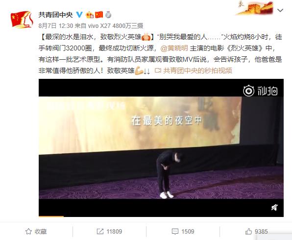 在《烈火英雄》的路演中,黄晓明一直希望观众忘记他们这些演员,记住真正的消防英雄们。同时他也身体力行担任武汉消防公益使者,为消防安全积极宣传。此前黄晓明为电影献声的宣传曲《别哭,我最爱的人》MV得到共青团中央、人民网和数十家公益官媒大力推广,逾百位明星好友也纷纷转发一齐致敬消防员。