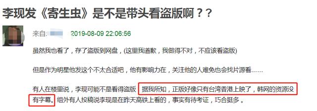 如果不去深究,这本来只是一次简单的分享,但有细心网友发现,《寄生虫》这部电影还未在内地上映,只有台湾和香港上映了,韩网虽有资源也没有字幕,一般不懂韩语的人是没办法去看原版,所以怀疑李现是看了盗版,认为他作为一个明星发这个不太合适。