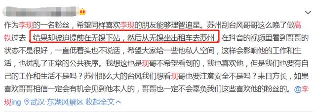 而事实上,李现确实在当天坐了高铁,甚至还有粉丝爆料,因为跟车粉丝太多,扰乱了正常的公共秩序,李现被迫提前下车,最终选择从无锡坐出租车去往苏州。