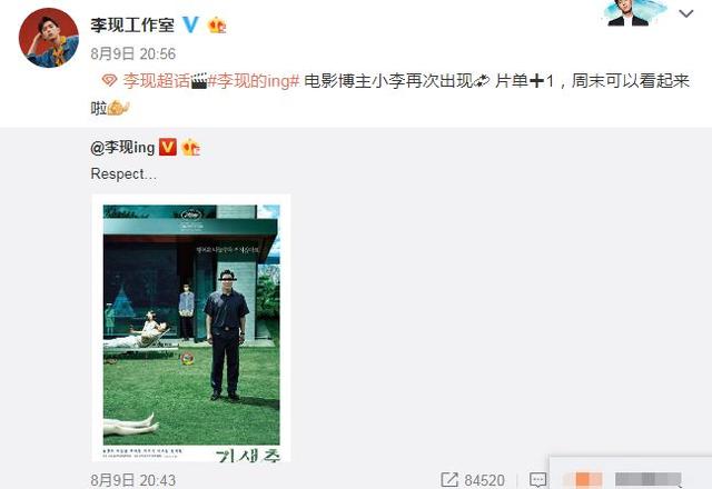 近日,李现在微博分享了韩国电影《寄生虫》的海报,表达了自己对这部电影的喜欢。随后李现工作室微博转发了这条微博,称“电影博主小李再次出现,片单+1,周末可以看起来啦。”