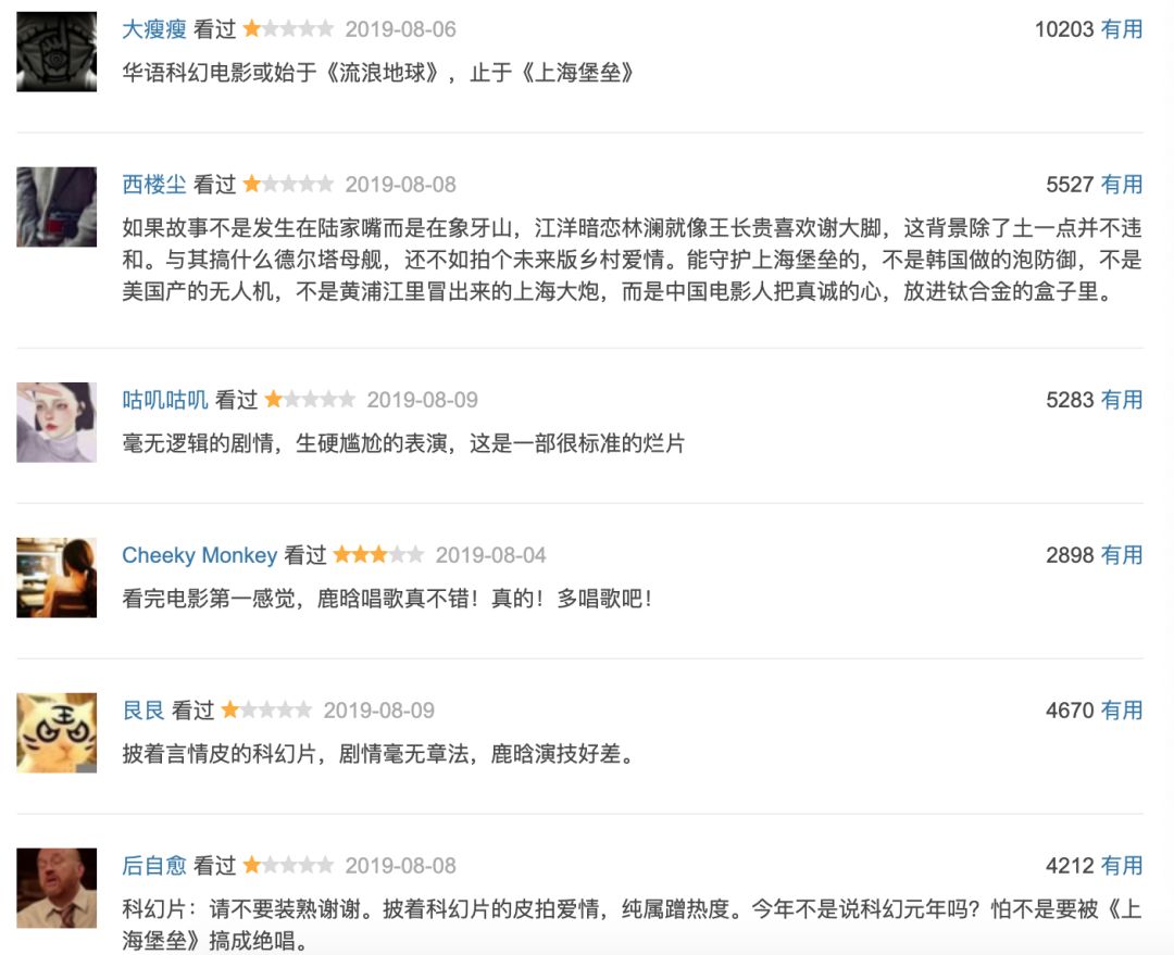 另外,也想稍微说些题外。《上海堡垒》是挺差的,也确实没什么看点。不过,全网崩成这样,我也真是没想到。已经看到各种角度的吐槽、嘲讽、甚至是谩骂了。我也觉得这片挺无趣,但真说多烂多雷,倒也不至于,更多还是无聊,无趣,不会拍的感觉。