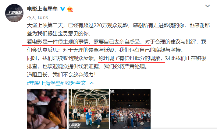 面对这种情况,8月10日,官方曾发文表示,看电影是一件很主观的事情,接受合理的建议和批评,但是也抵制无理的谩骂和诋毁。同时还指出,表示出现了有偿打低分的现象。