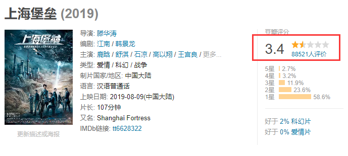 该影片原著有着很高的知名度,再加上《流浪地球》的火爆,令观众对这类科幻题材有着很高的期待。但是目前这部影片的评分是3.4。