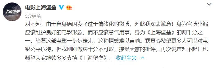 很快,官方便秒删了怒怼文字,转而发布了一则道歉声明,表示:“对不起!由于自身原因发了过于情绪化的微博,对此我深表歉意!身为官博小编应该维护良好的电影形象,而不应该意气用事。身为《上海堡垒》的两千分之一,陪着这部电影一步步走来,这种情感难以言喻。我真心希望更多人可以对电影公平以待,但我刚刚做法十分不可取,接受大家的批评,再次说声对不起!也希望大家继续多多支持《上海堡垒》。”