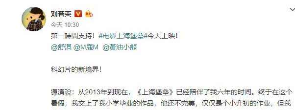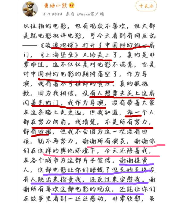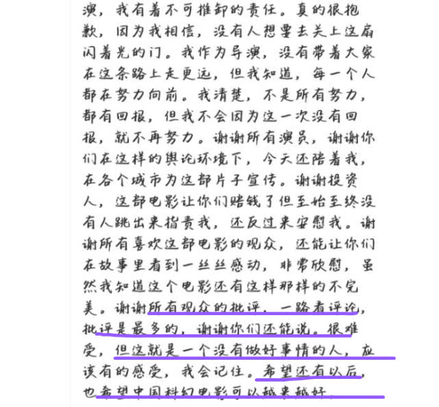 在文章中,导演也是称看到观众们评价说《流浪地球》开启了中国电影的科幻大门,而《上海堡垒》又给关上了,自己是非常难过的。毕竟虽然不是努力就有收获,但作为导演,没有把电影带到更好的程度,其实是难辞其咎的。最重要的是,即便舆论环境恶化成这样,演员们依旧和自己站在一起,也是相当的欣慰。当然自己最对不起的就是投资人和制片方了,亏了这么多钱,作为导演难辞其咎,但是投资方却没有任何人跳出来指责自己,让他也是很感动。