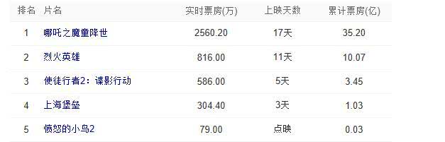 从最新的票房成绩上看,《哪吒》都要奔着40亿的成绩去了,甚至连《黄晓明》的烈火英雄都破了10亿大关,而上海堡垒上映三天才刚刚破亿。要知道上海堡垒的总投资3个多亿,需要10亿元的成绩才能回本,就按照目前的成绩看,巨亏也是成定局了。