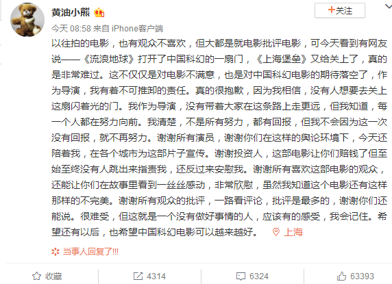 这个分数的出现,已经不能用普通的“烂”来形容了。对此,《上海堡垒》导演滕华涛发文表示了歉意,还表示感谢自己的投资人,即便这部戏赔钱了,也没有人跳出来指责自己等等,最后也希望中国科幻电影越来越好。