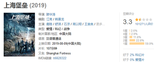 但此次《上海堡垒》的上映,使得很多网友吐槽其将中国科幻这扇门又给关上了,还有网友更是直接称不仅关上了还给上了把锁。可见,大家对这部电影的“意见”了。其在豆瓣上的评分更是一路走低,已经到了3.3分。