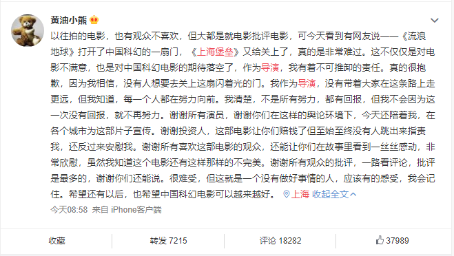 原标题:《上海堡垒》导演道歉:不想关中国科幻的门《上海堡垒》导演道歉:不想关中国科幻的门。 今年年初的《流浪地球》上映后,让不少影迷对国产科幻电影充满了期待,然