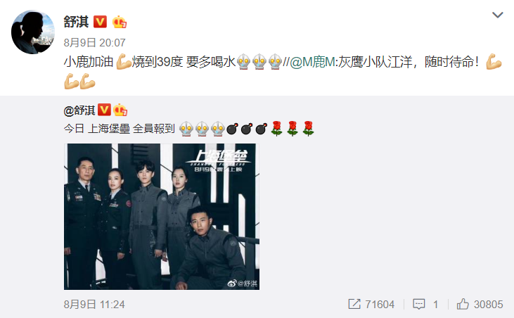 至于为什么?我们先看一点,在8月9日,电影上映之前,电影方面曾联合主演鹿晗、舒淇等人一同在微博上进行造势宣传,本来也就是一段段官方用词,但舒淇在转发电影宣传的时候,却重点提到鹿晗高烧39度,并且,舒淇还特意叮嘱鹿晗要多喝水。