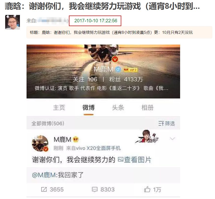 这其中,鹿晗曾在晚上9点开始,通宵8小时一直到凌晨5点玩电脑吃鸡游戏,到了早上9点不睡觉还上线看了会儿微博,12点左右又跑去玩手游。