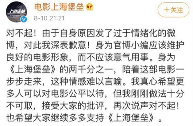 不得不说,作为电影官方,《上海堡垒》官微如此苦大仇深的模样确实有失风度,果然,在网友纷纷批评其行为不妥后,官微将以上动态如数删除,并发文致歉称:官博小编纯属自己意气用事,才说了情绪化的话,影片的制作花了很大心血,真心希望能得到大家“公平对待”。