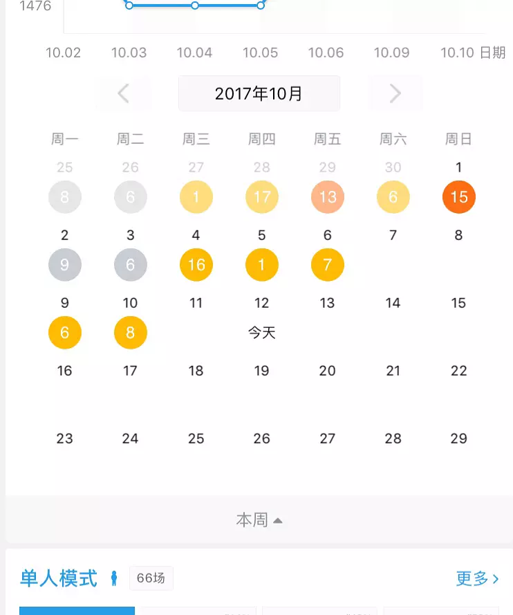 而网友经过统计后也发现,鹿晗2017年整个10月份中,除了7号8号两天之外,其余时间都或多或少在玩游戏,下图中圆圈的数字代表游戏的次数,其中,有超过4次游戏次数上个双位数,平均下来每天游戏15次!
