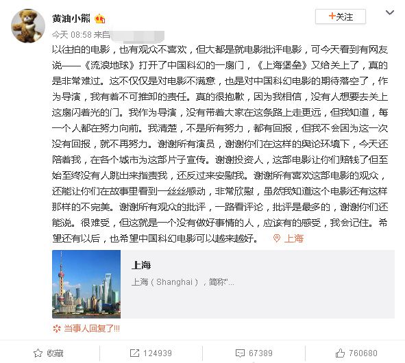 面对铺天盖地的差评,导演滕华涛被迫道歉,他承认电影让投资人赔了钱,也让观众失望了,对于被指《上海堡垒》关上了中国科幻的门,他则表示“没有人想要去关上这扇闪着光的门。”