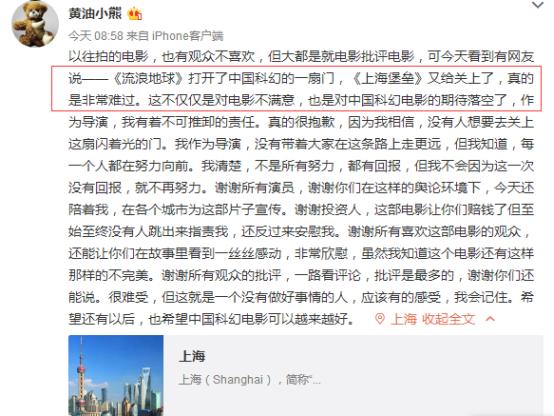 因为这部影片的口碑和票房都不好,导演还特意发微博道歉,导演表示最让自己感到抱歉的是有网友说《流浪地球》打开中国科幻的一扇门,而《上海堡垒》却给关上了,导演说听到这样的话真的很难过!导演的道歉很诚恳,但道歉过后是不是该反思些什么呢?比如剧本、比如特效、比如演员等等!