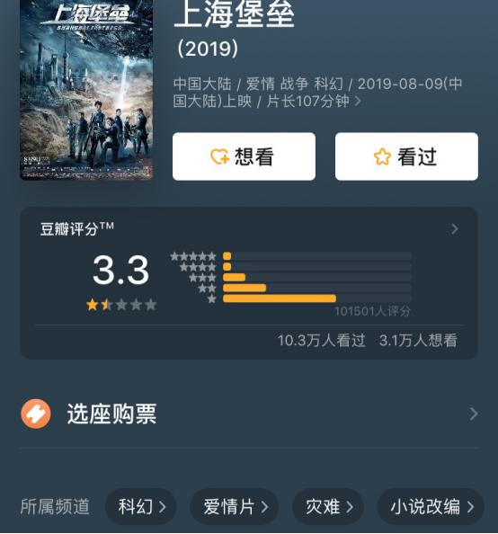 最近由舒淇和鹿晗主演的《上海堡垒》上映之后获得了除了粉丝之外清一色的一星差评!目前获得了3.3分的超低分,由于流量的粉粉黑黑,所以流量参演的电影大部分都不会拿到高分,不过到底是不是烂片,观众心中自有定论!粉黑抵消后,其实还是路人评价多!所以3.3的低分足以证明这部影片的质量了!