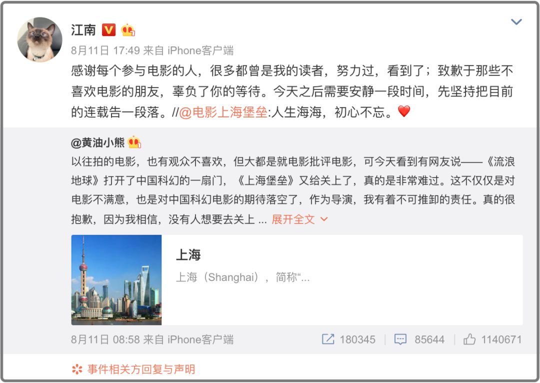 最后该电影的原作作者、编剧江南也转发致歉:“致歉于那些不喜欢电影的朋友,辜负了你的等待。”