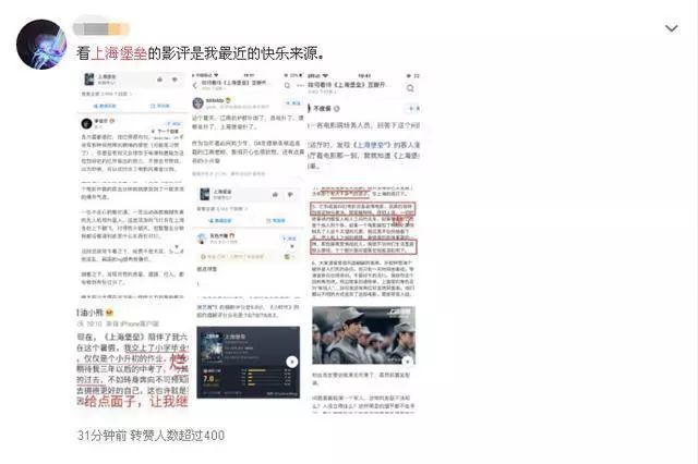 目前,网友对《上海堡垒》的吐槽几乎沸腾到顶点,甚至很多网友称对这部片子的吐槽已经成为大家的欢乐源泉。很显然,对这部片子的吐槽已经引起了网友的集体狂欢。