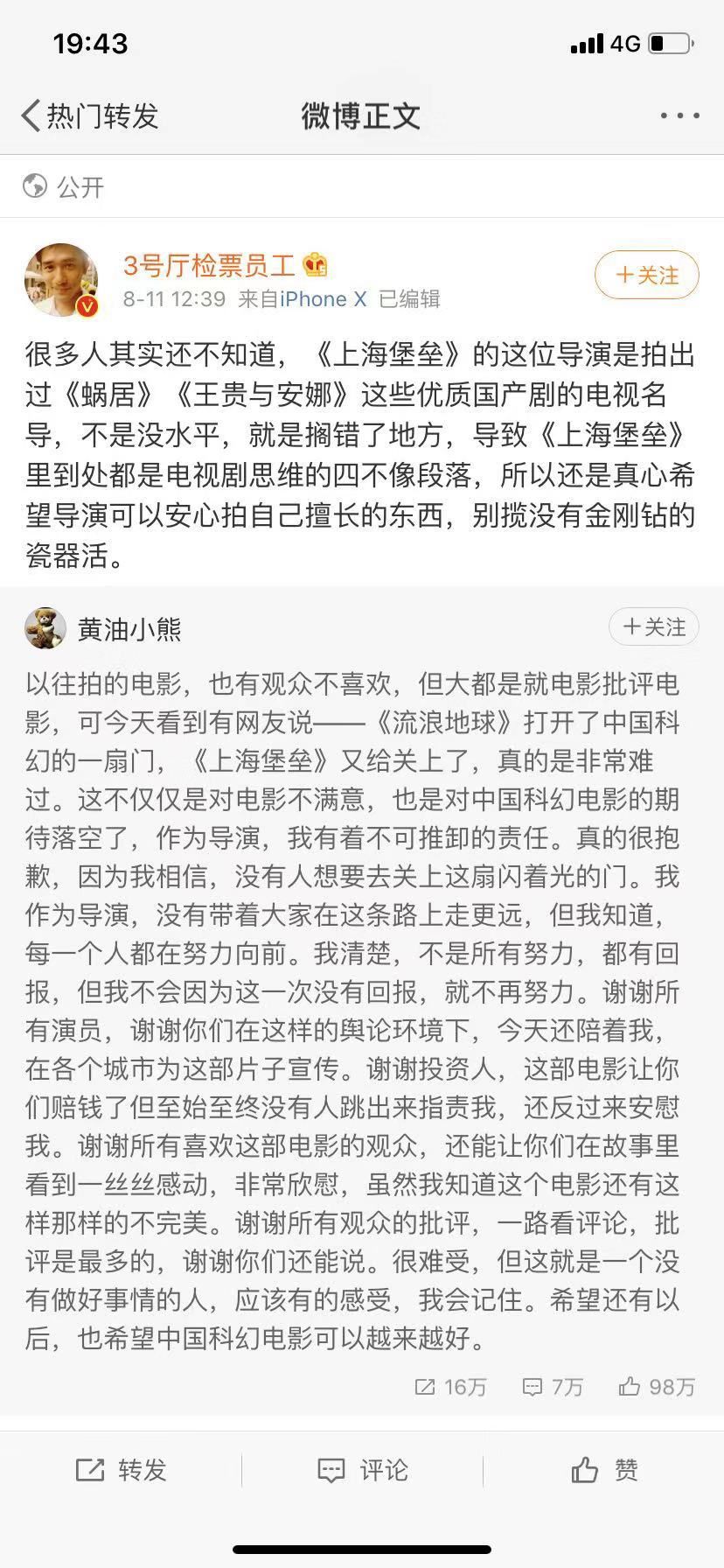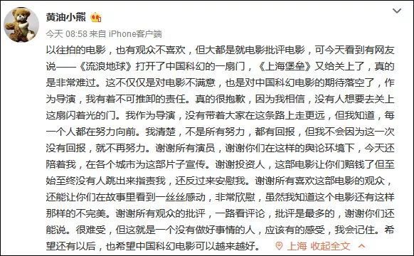 “很难受,但这就是一个没有做好事情的人,应该有的感受,我会记住。希望还有以后,也希望中国科幻电影可以越来越好。”