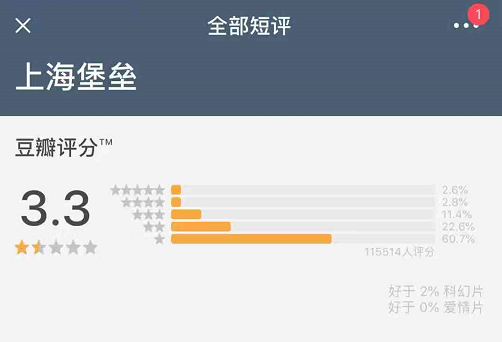 影片上映后遭遇差评,截止8月11日,《上海堡垒》豆瓣评分仅为3.3分,60.7%的观众为影片打出了一星。电影的口碑、票房均不尽人意,甚至可以用快速坍塌来形容其扑街的速度。