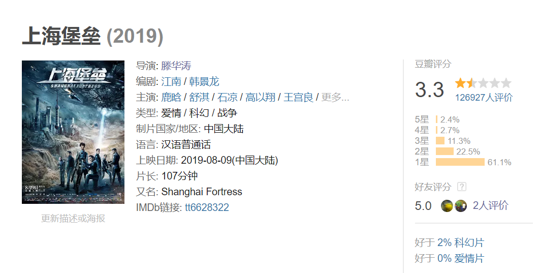 8月9日上映的《上海堡垒》正在热映中,但口碑不佳,上映不到两天评分刷刷往下掉,目前豆瓣上有接近13万人看过,给出的评分才3.3,只好于2%的科幻片,有超过61%的观众给出了1星,不知最终评分是否还会下降。
