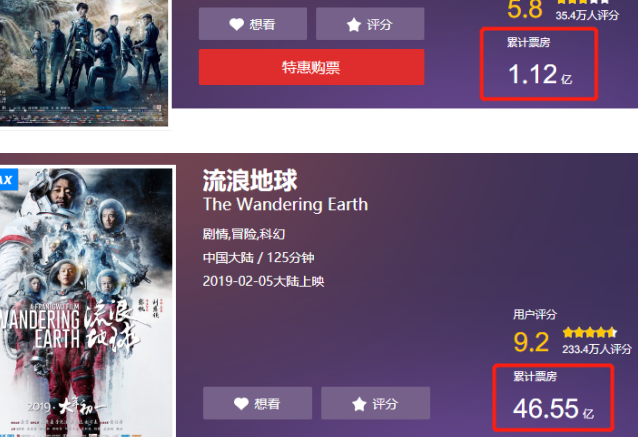 但电影上映之后评分却一再走低,目前已跌至3.3,而《流浪地球》评分却高达7.9。除了评分之外,该电影的票房也非常令人担忧,上映4天才勉强破亿。