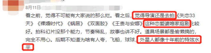 甚至还有网友直言:《流浪地球》打开的中国科幻大门,被这部电影给关上了。8月11日一早,该电影的导演就在社交平台发长文道歉,称自己接受批评,希望科幻电影越来越好。