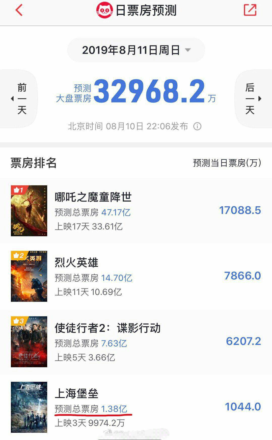 截至目前,《上海堡垒》的排片率和上座率依然无法与同期其它影片相提并论,猫眼预估的票房总量已经跌至1.5亿以下,甚至有继续下滑的趋势。