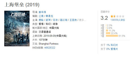 上海堡垒于今年八月份上映,投资八亿,豆瓣评分3.2百度评分4.5分,如今票房不到两亿。