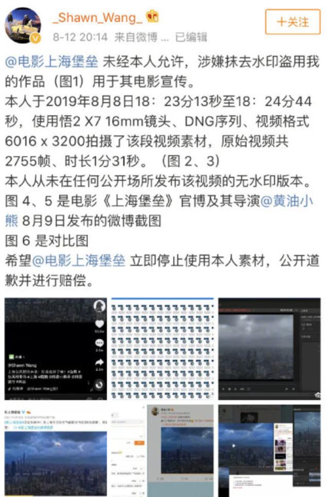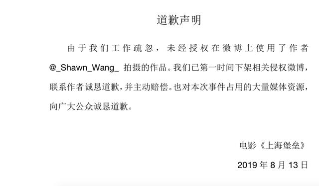 该作者是昨日爆料,在8月13日多家八卦媒体争相报道此事,事件得到进一步的发酵和传播。13日中午,《上海堡垒》官博发布声明表示歉意:由于我们工作疏忽,未经授权在微博上使用了原作者拍摄的作品。我们已第一时间下架相关侵权微博,联系作者诚恳道歉,并主动赔偿。也对本次事件占用的大量媒体资源,向广大公众诚恳道歉。