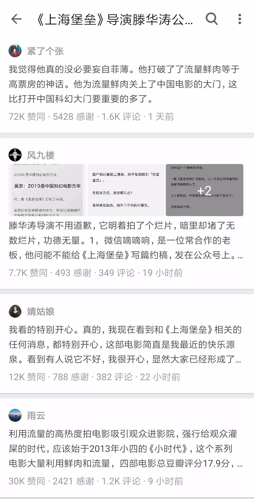 电影的票房失利还引发了广泛讨论。自8月9日以来,关于《上海堡垒》票房及内容的讨论多次登上微博热搜。8月12日《上海堡垒导演滕华涛公开道歉,你怎么看?流量电影是否已死》的讨论以8000多万的热度占据了知乎热榜第一的位置。而在该问题下,多数高票回答均赞成“流量电影已死”的观点。