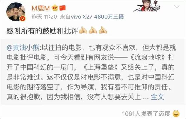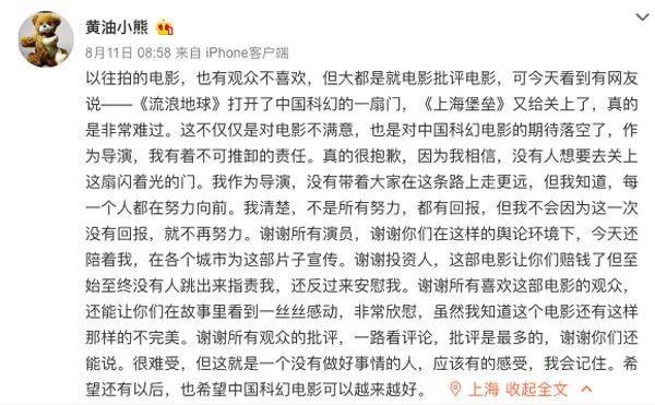 对此,导演滕华涛在微博发文致歉“不想关上中国科幻的门”:“真的很抱歉,因为我相信,没有人想要去关上这扇闪着光的门。看到观众的评价后非常难过,感觉到他们不仅仅是对电影不满意,也是对中国科幻电影的期待落空了,作为导演,自己有着不可推卸的责任。谢谢所有观众的批评,一路看评论,批评是最多的,谢谢你们还能说。很难受,但这就是一个没有做好事情的人,应该有的感受,我会记住。希望还有以后,也希望中国科幻电影可以越来越好。”