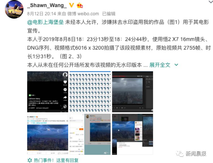 在昨晚,微博名为“ShawnWang_”,介绍为视频自媒体的博主,在微博上直指《上海堡垒》宣传方未经允许,涉嫌抄袭他的作品,并配图说明。