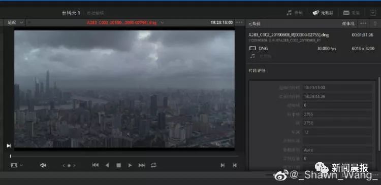 “本人于2019年8月8日18:23分13秒至18:24分44秒,使用悟2 X7 16mm镜头、DNG序列、视频格式6016 x 3200拍摄了该段视频素材,原始视频共 2755帧、时长1分31秒。”
