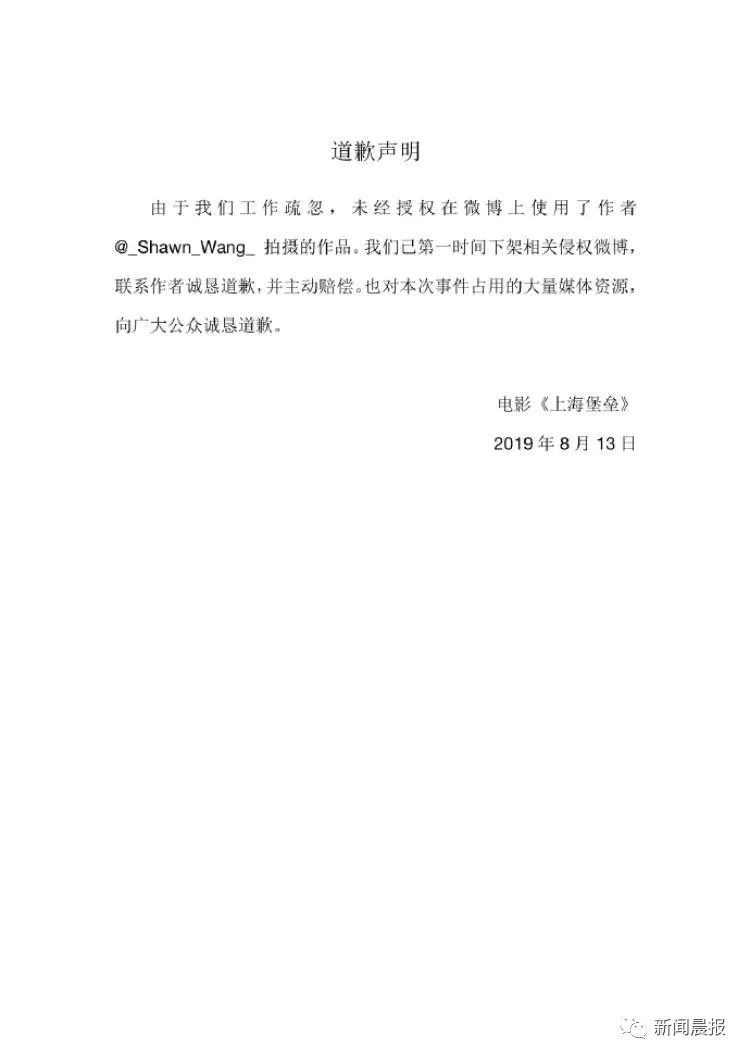 由于工作疏忽,未经授权在微博使用了作者ShawnWang_拍摄的作品,我们已第一时间下架相关侵权微博,联系作者诚恳道歉,并主动赔偿。也对本次事件占用大量媒体资源,向广大公众诚恳道歉。