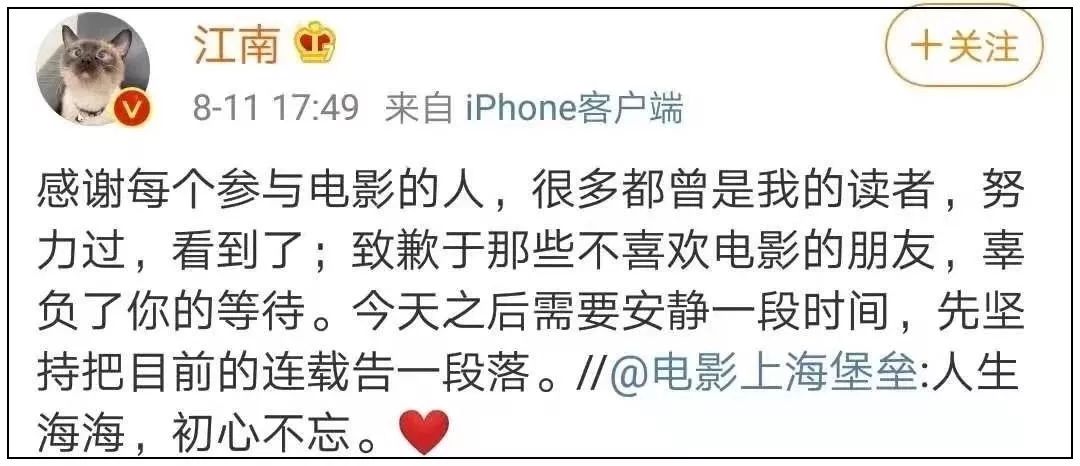 《上海堡垒》的原作者江南致歉称“辜负了你们的等待”。
